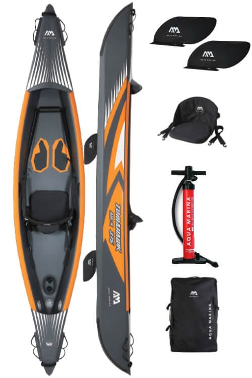 The Aqua Marina Air-K 12’4″ is an inflatable double kayak and is suitable for the novice and advanced kayaker. Thanks to the drop stitch technology, the side chambers and floor are stiffer and faster to inflate. The kayak has an adjustable high backrest with a spongy cushion and multiple storage compartments, the kayak also includes water splash protection on both the front and rear.